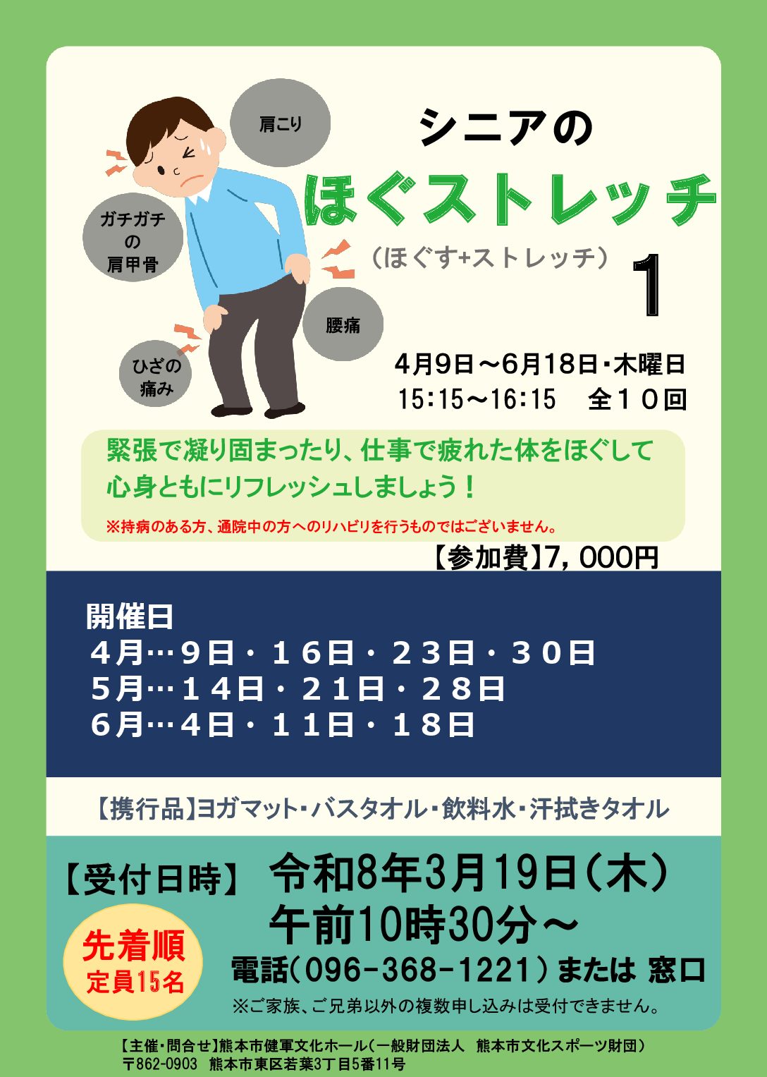 令和8年3月19日(木)10時30分から電話(096-368ー1221)または窓口で受付(先着順)開始いたします。定員に達し次第、受付は終了させていただきます。