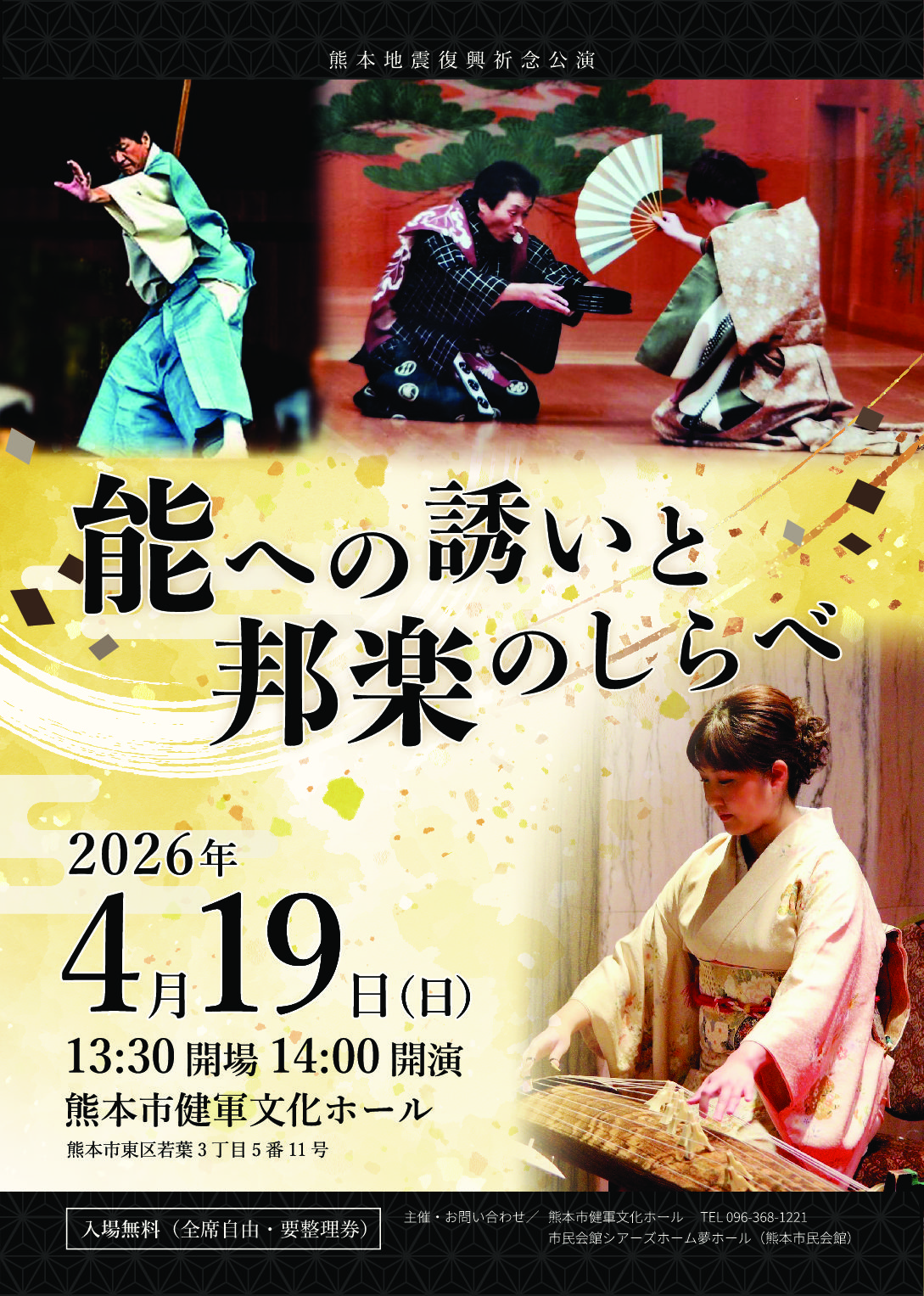HOMEhorizontal_ruleただいま募集中 WATCH ただいま募集中のイベント カテゴリーで探す すべて コンサート等 ただいま募集中 文化活動振興事業 熊本市消防音楽隊スプリングコンサート 終了 芸術文化団体等助成事業 掲載年で探す すべて 2026 2025 2026年3月17日 熊本地震復興祈念公演「能への誘いと邦楽のしらべ」 コンサート等ただいま募集中
